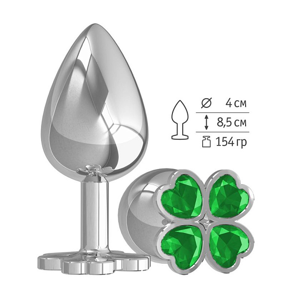 Анальная втулка c кристаллом "Клевер" Большая анальная втулка выполнена из металла и имеет размеры, подходящие для яркой анальной стимуляции. Ограничитель (стоппер) и разноцветные стразы добавят игривости и красок в ваши игры, а увеличенный размер рельеф сделает ощущение для обоих партнеров ярче. Металлическая анальная втулка прекрасно подойдет для игр с температурными режимами, так как ее можно нагревать и охлаждать по вашему желанию. Можно использовать с ЛЮБЫМИ видами лубрикантов. Анальная пробка упакована в пакет с фирменным логотипом, в комплекте есть мешочек для хранения.Характеристики