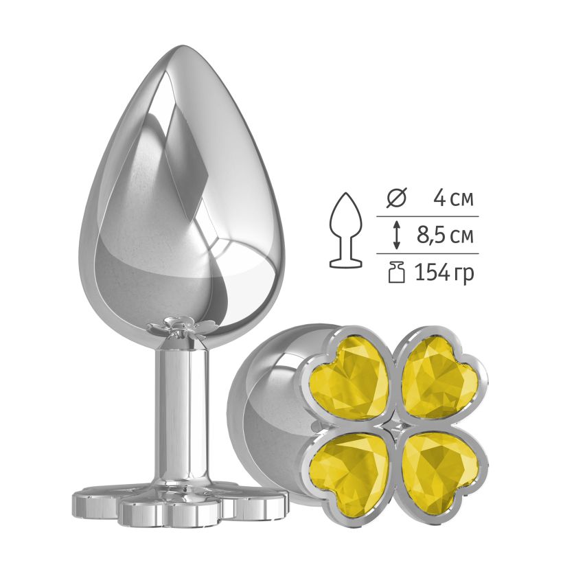 Анальная втулка c кристаллом "Клевер" Большая анальная втулка выполнена из металла и имеет размеры, подходящие для яркой анальной стимуляции. Ограничитель (стоппер) и разноцветные стразы добавят игривости и красок в ваши игры, а увеличенный размер рельеф сделает ощущение для обоих партнеров ярче. Металлическая анальная втулка прекрасно подойдет для игр с температурными режимами, так как ее можно нагревать и охлаждать по вашему желанию. Можно использовать с ЛЮБЫМИ видами лубрикантов. Анальная пробка упакована в пакет с фирменным логотипом, в комплекте есть мешочек для хранения.Характеристики