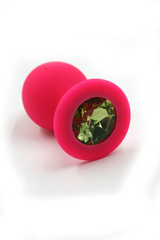 Анальная пробка из силикона розового цвета, размер M. Длина - 7 см, диаметр - 3,5 см, вес - 46,5 грамма. Страз в основании круглой формы, выполнен из стекла светло-зеленого цвета. Упакована в вельветовый мешочек для хранения.Характеристики